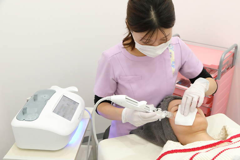 スピーディかつ均一に注入ができる機械打ち(水光注射)と、位置・深さ・注入量の調節など細やかな対応ができる医師の手打ちの両方に対応しております。